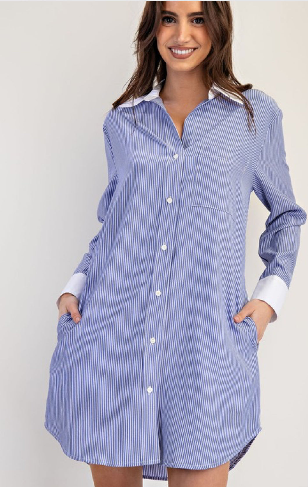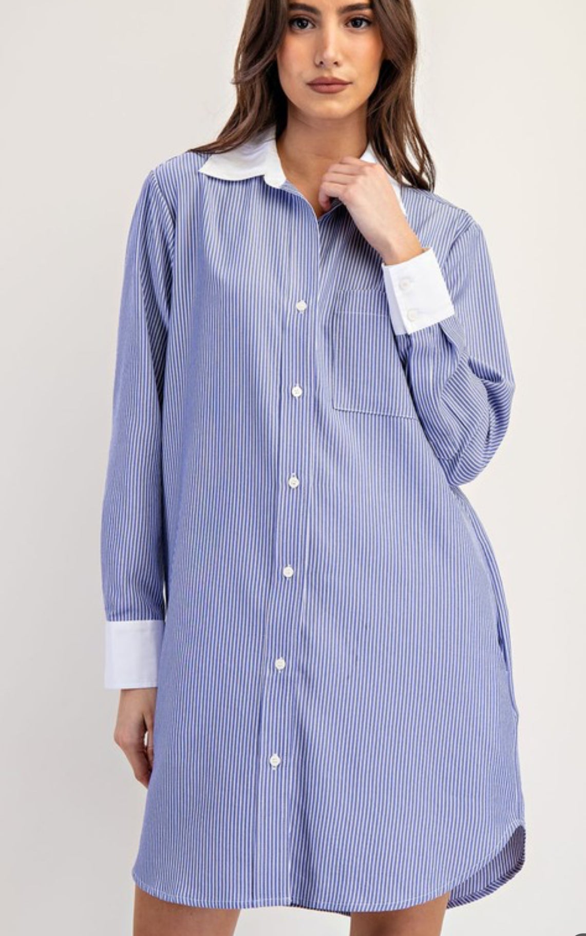 This striped long sleeve dress showcases a crisp contrasting white collar and cuffs, a button down front, a single chest pocket, double buttoned cuffs, two side hip pockets, a back pleat detail, and a curved hemline, all in a relaxed fit silhouette for a refined yet laid back appeal.