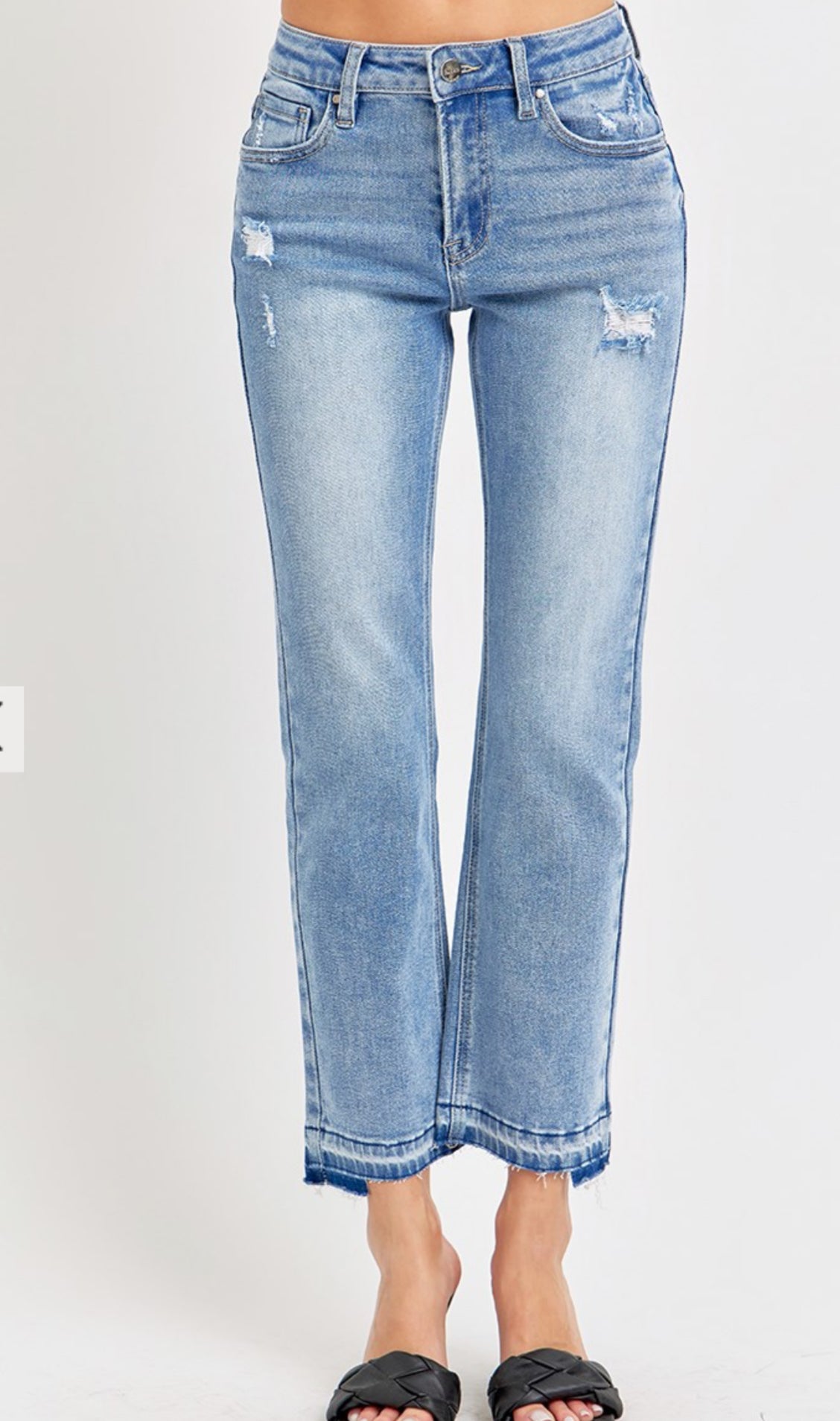 MID RISE ANKLE STRAIGHT UNEVEN RELEASED HEM JEANS- Rise 9 1/2" | Inseam 28" in size 3/26- Model Info: Height 5'8" | Waist 23" | Hip 34"- Model is wearing size 1