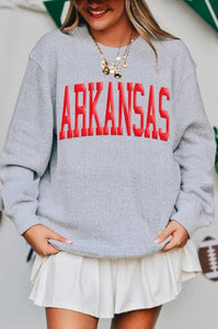 Game day just got cozier. This silver knit sweatshirt features bold Arkansas puff ink across the front, combining team spirit with everyday comfort. Crafted from a plush, textured knit, it’s a unisex mid-weight crewneck with ribbed cuffs and waistband—perfect for layering through the season.