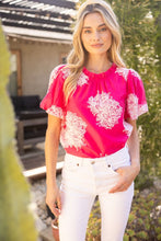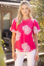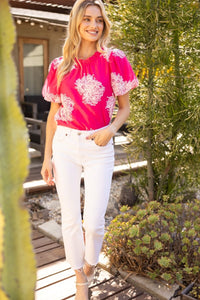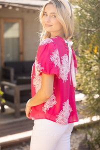 • Round neckline with ruffle• Short bubble sleeves• Contrast twill tape back tie details• Fully lined• Floral embroidered woven fabric top• Size information:Model height 5' 8”, wearing size Small