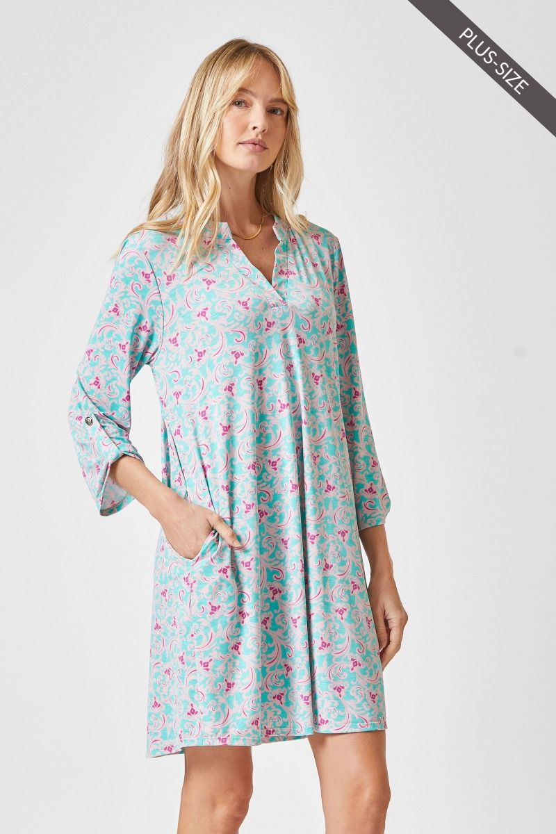 This is our classic a line dress that features lizzy neckline and tabbed sleeves. We love the shift dress on this wrinkle free material that is just so flattering with fun prints! Non sheer, knit. Stretchy.