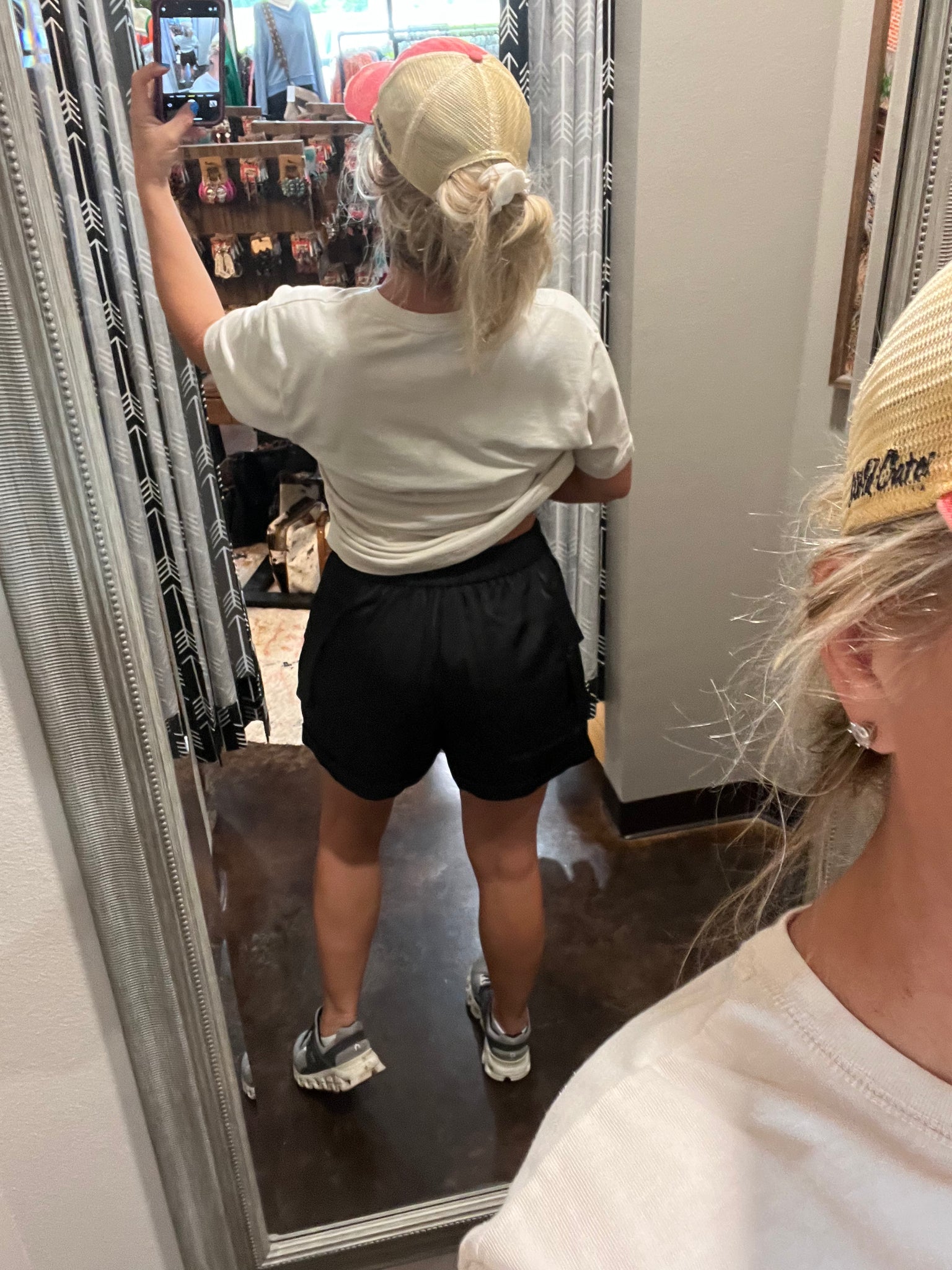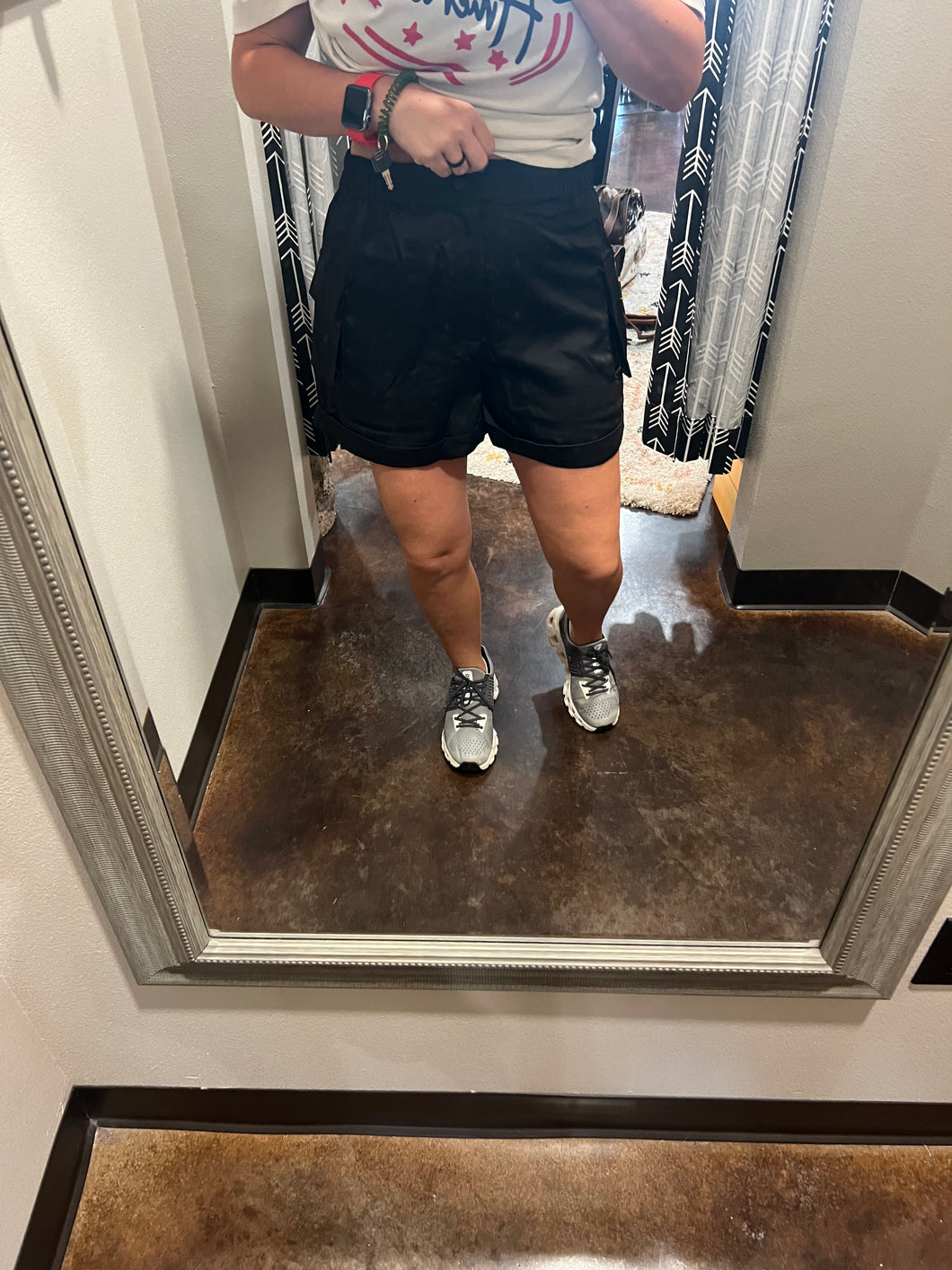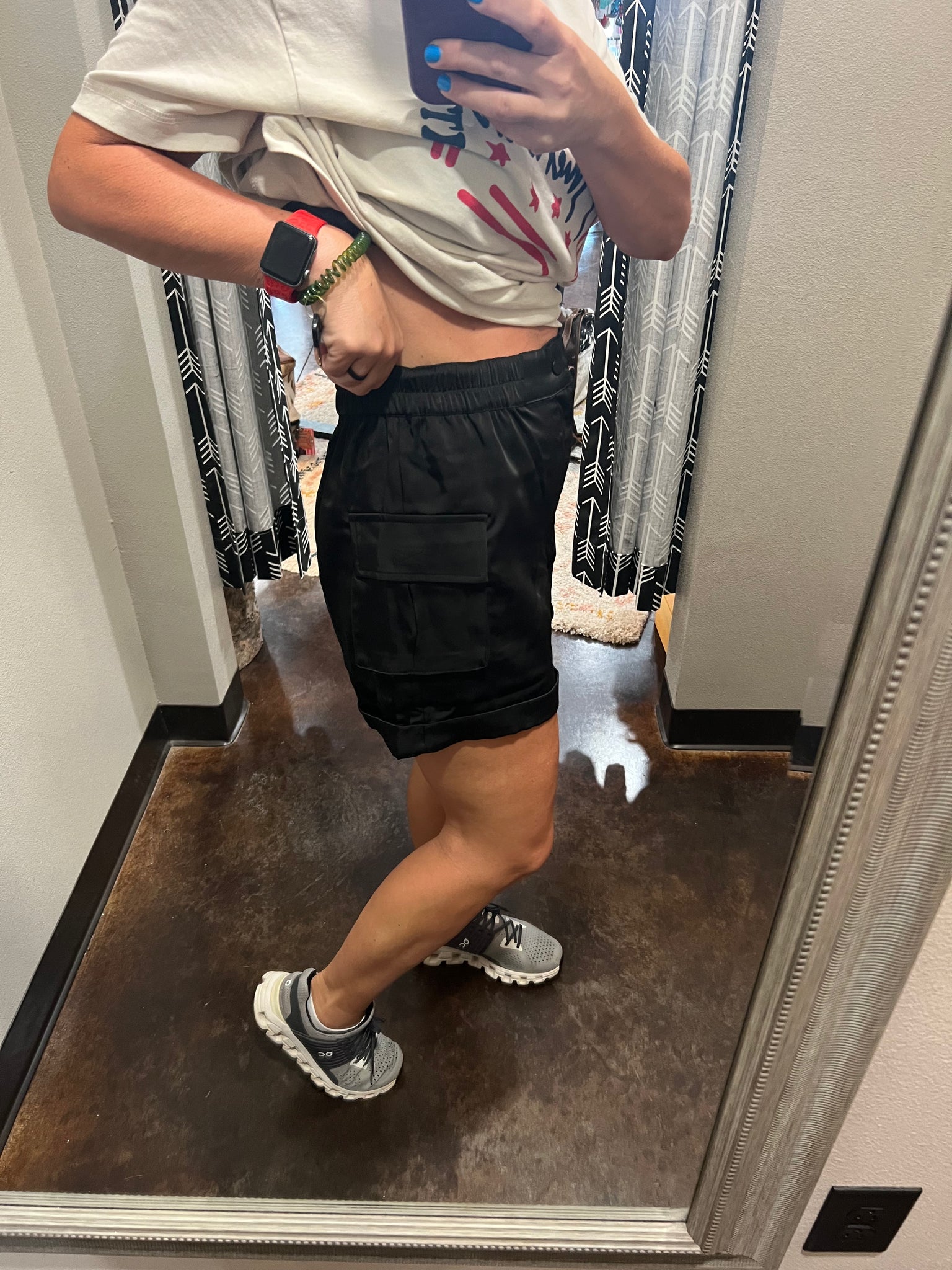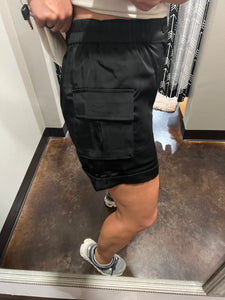 Solid satin cargo shorts featuring a button and zipper closure, an elastic waistband, two side cargo pockets and is a relax fitted silhouette. Model is 5'9" and is wearing a small.